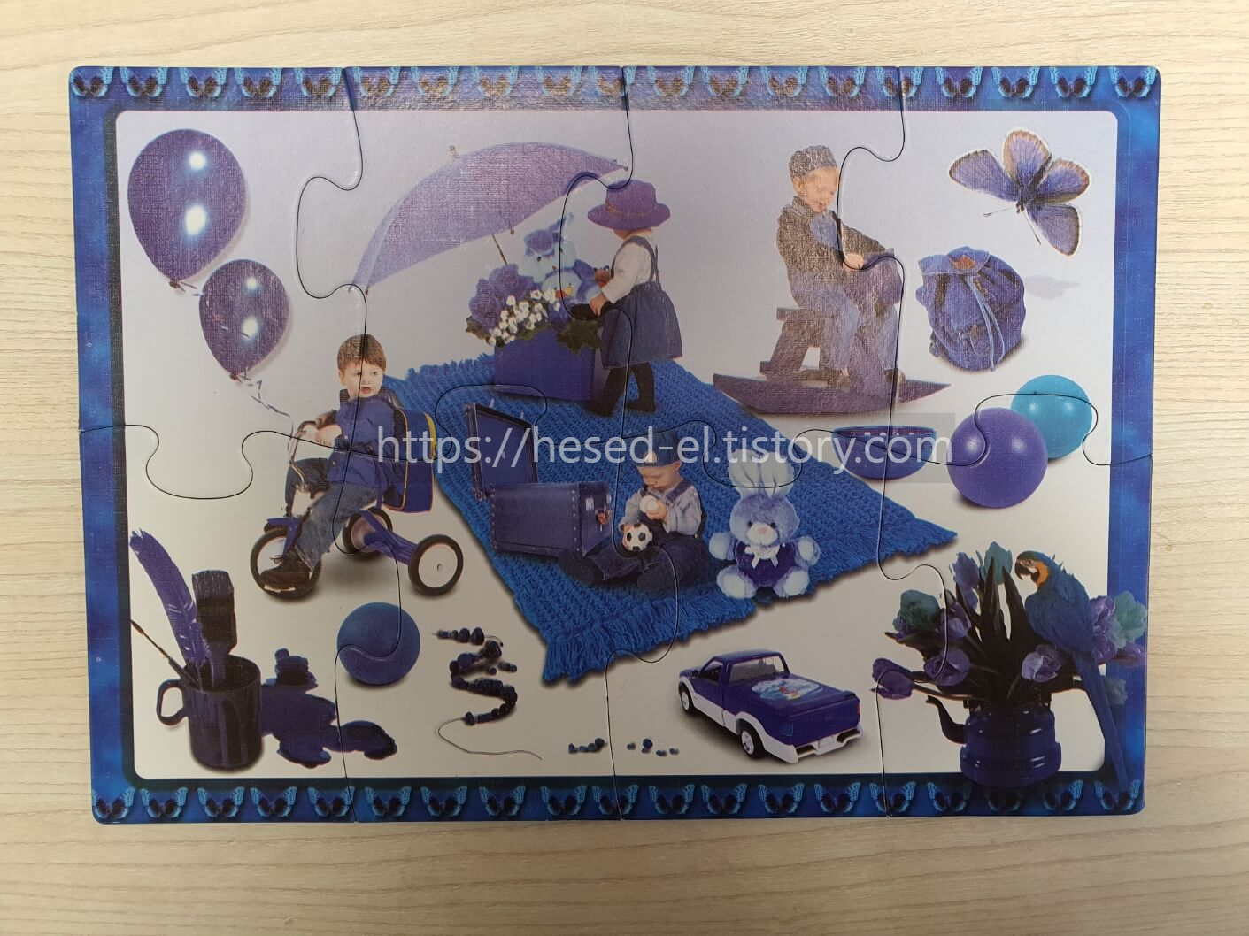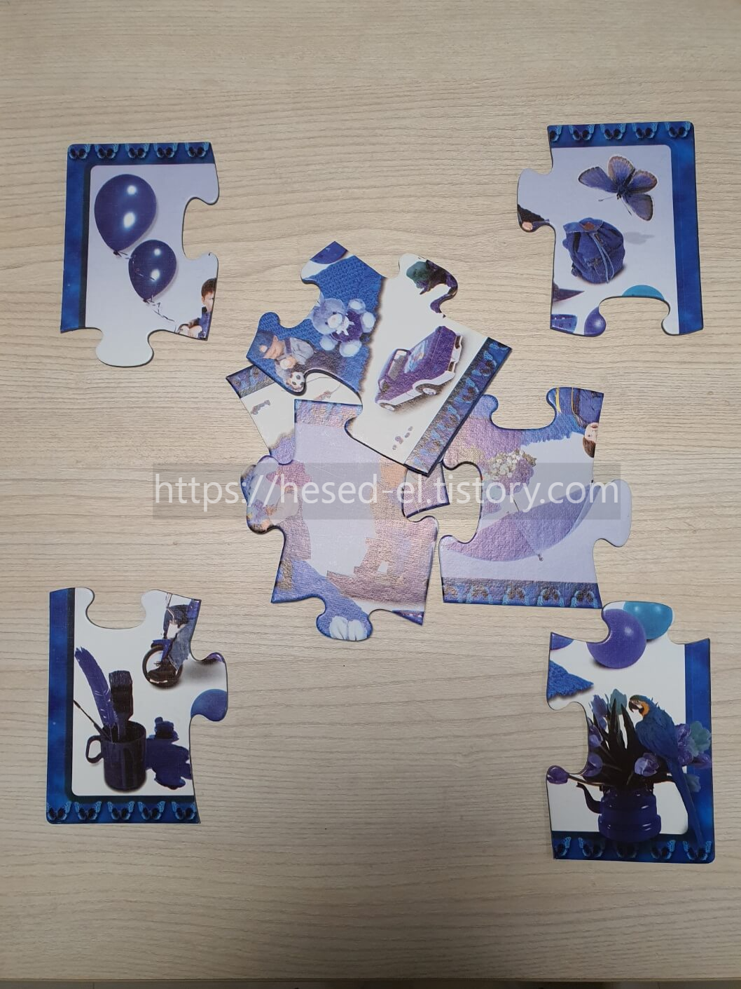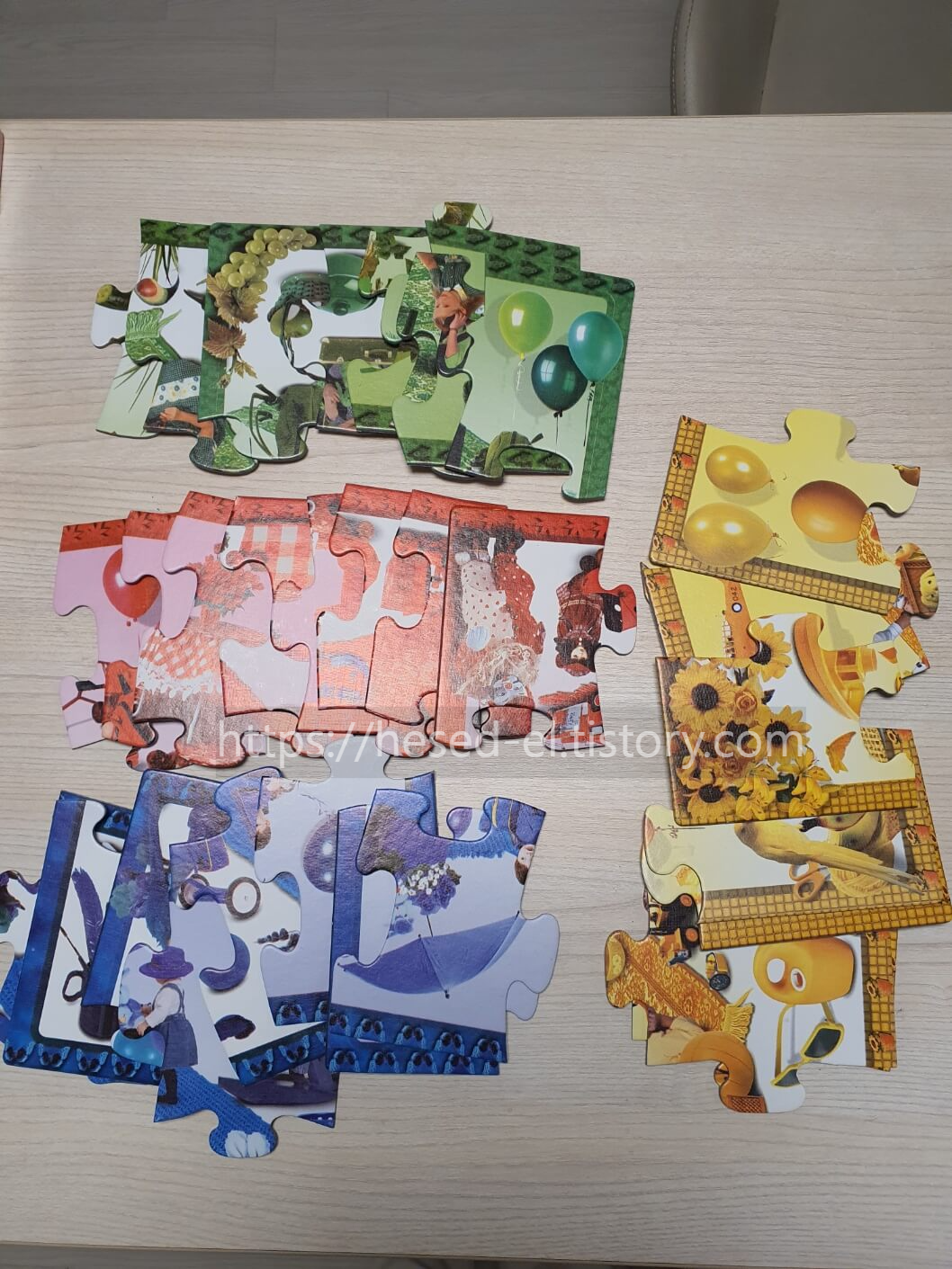 1. 퍼즐 조각을 모두 펼쳐놓고 각각의 색깔에 따라 분류해 본다. 아동은 한가지 색깔을 선택하고 자신이 선택한 색에 해당하는 모든 조각을 가져온다