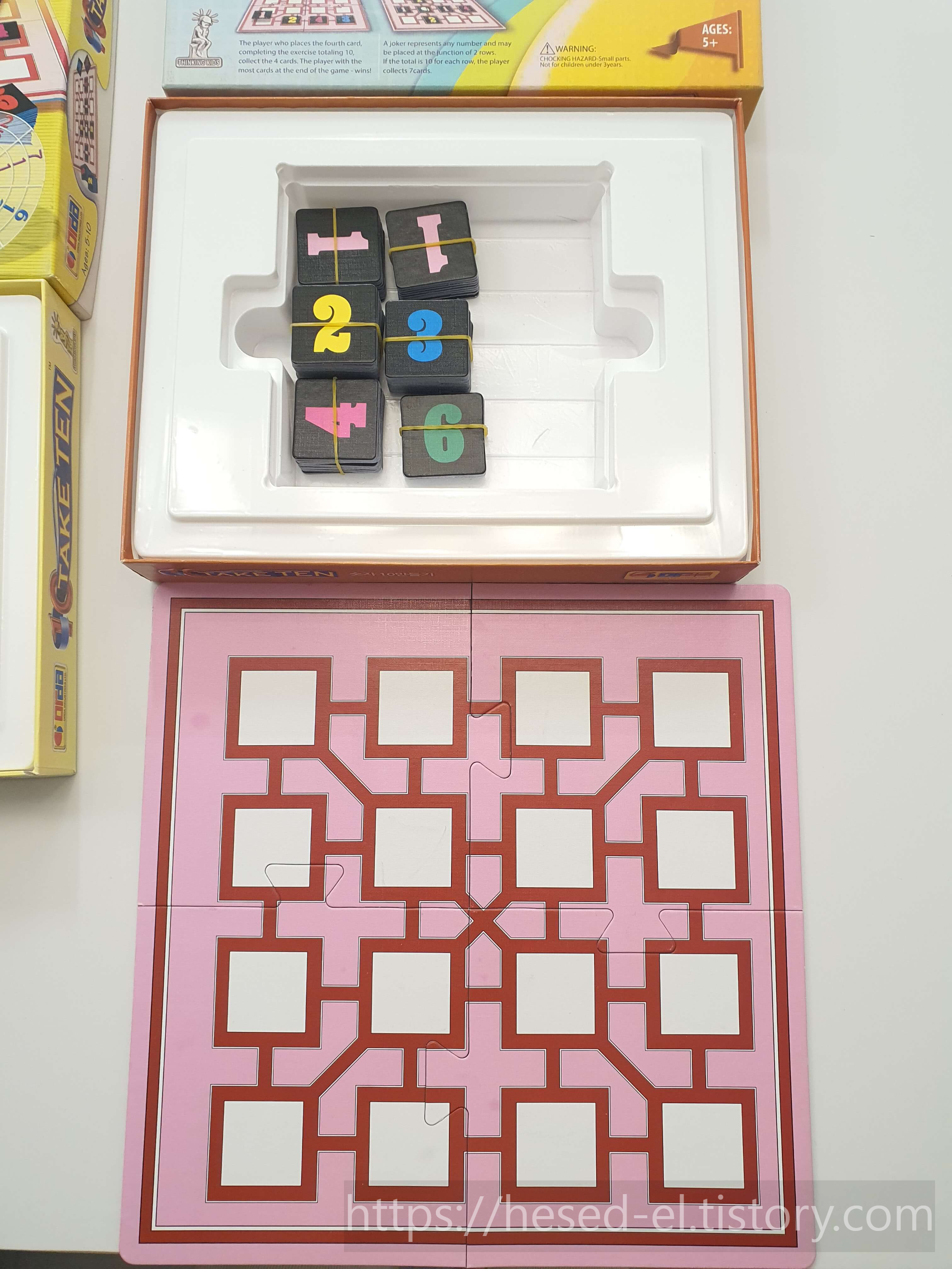 놀이 자료 : 네 조각으로 분리된 게임판 1개, 숫자 카드 64장 (1-21장, 2-16장, 3-12장, 4-7장, 5-4장, 6-2장,7-2장,조커 2장)