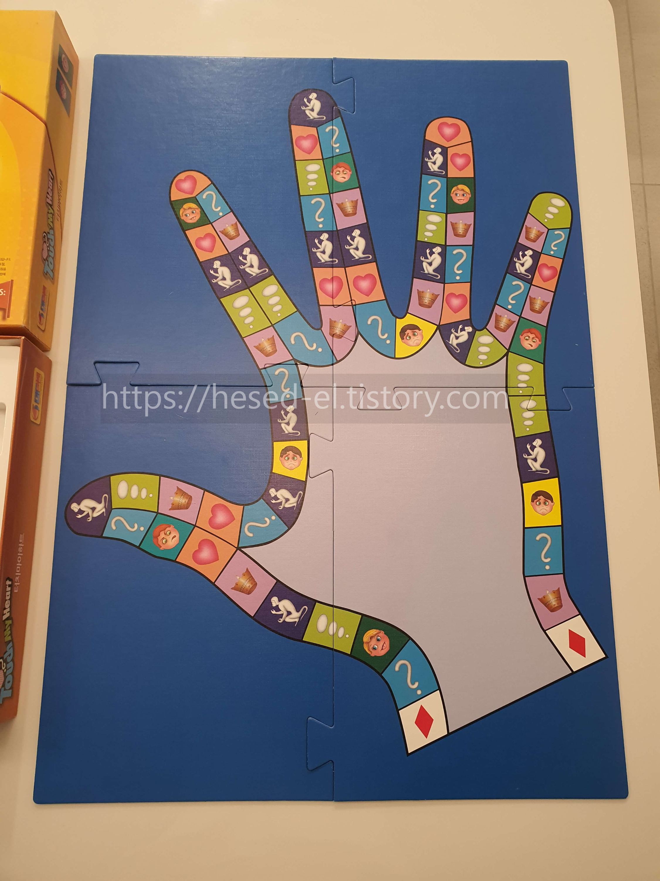 1. 각 게임자는 자기 게임 말을 손 모양의 게임판 오른쪽에 있는 빨간색 다이아몬드 출발점에 놓는다.