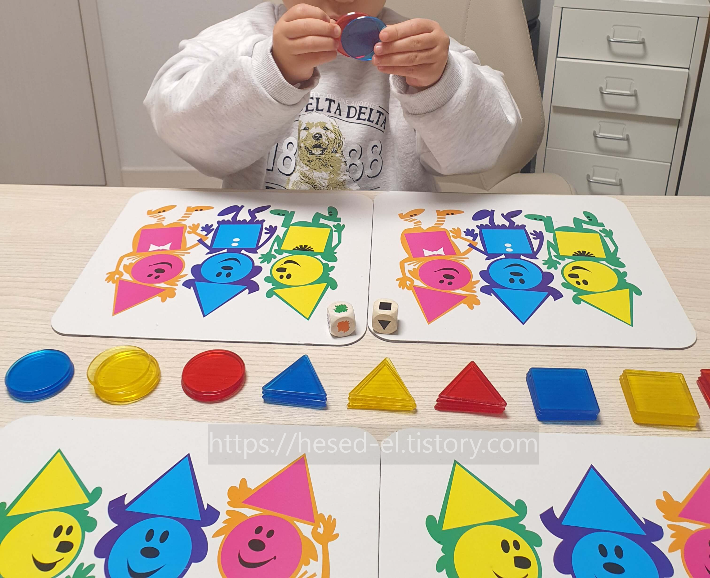 놀이자료: 게임판 4개, 도형 조각 36개, 도형 주사위 1개(원,삼각형,사각형), 색깔 주사위 1개(초록,주황,보라색)
