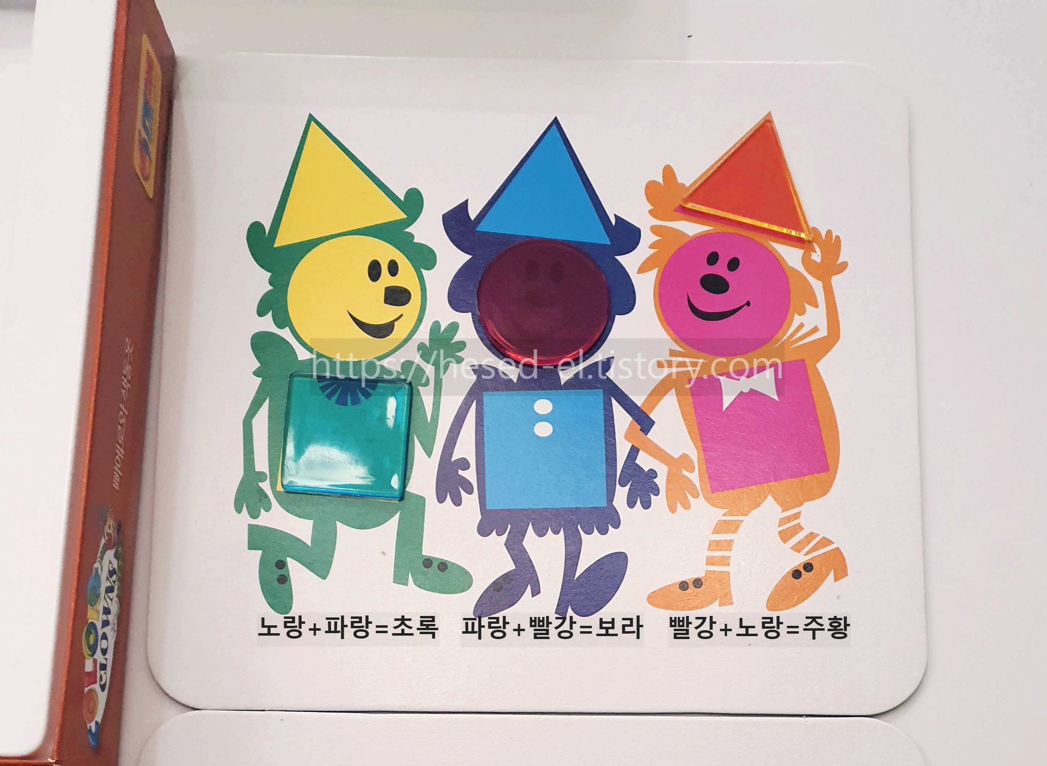 스케치북에 적혀있는 색의 혼합에 대한 내용이 어느 정도 이해되었으면 아동에게 스스로 도형 조각 두 개를 합쳐서 어떤 색깔로 변하는지 살펴볼 것을 지시한다. (이때 형광등 불빛에 비춰볼 것을 지시하면 더욱 선명한 색깔을 확인할 수 있다.)