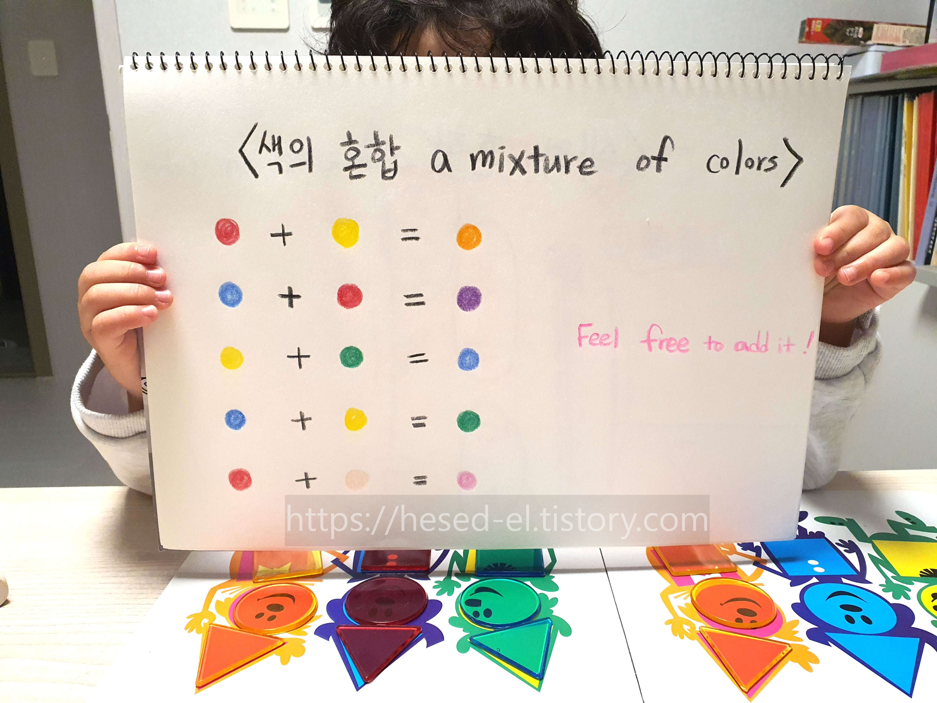스케치북의 내용을 토대로 5세 아동이 스스로 파란색 원과 노란색 원을 합쳐보고 있다. 겹친 부분이 초록색으로 변하는 것을 자기 눈으로 직접 확인한다. 또 빨간색 원과 파란색 원을 맞대어보면서 보라색이 되는 것을 스스로 경험하고 있다. 이를 통해 색에 대한 호기심이 자극되며 색 섞임에 대한 깊은 이해와 자신감이 생긴다.