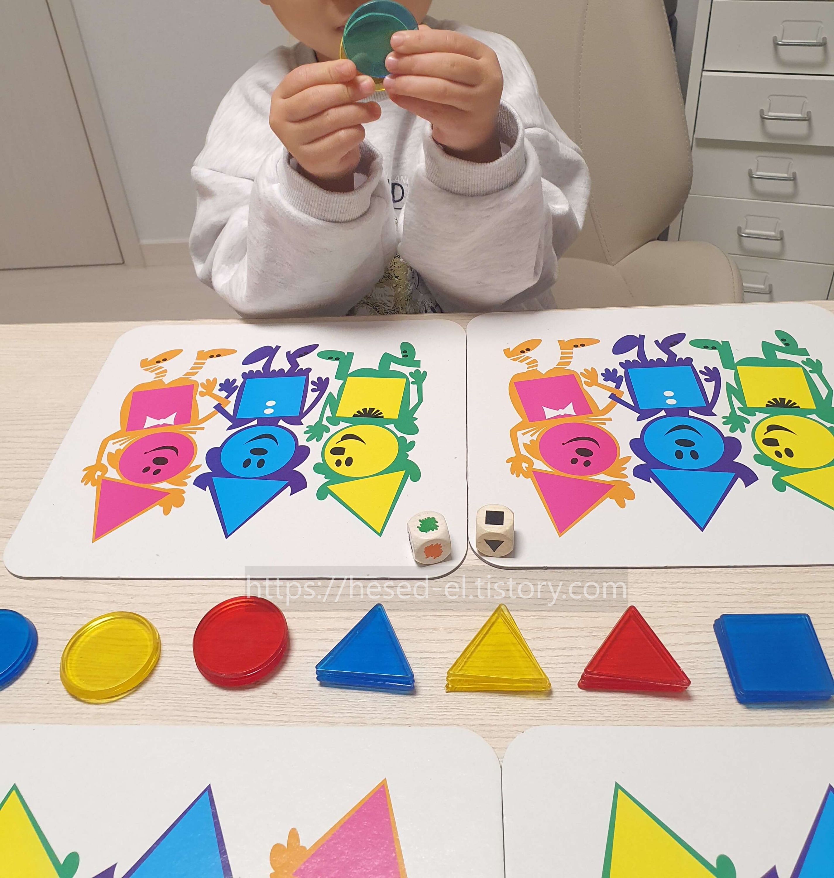놀이자료: 게임판 4개, 도형 조각 36개, 도형 주사위 1개(원,삼각형,사각형), 색깔 주사위 1개(초록,주황,보라색)