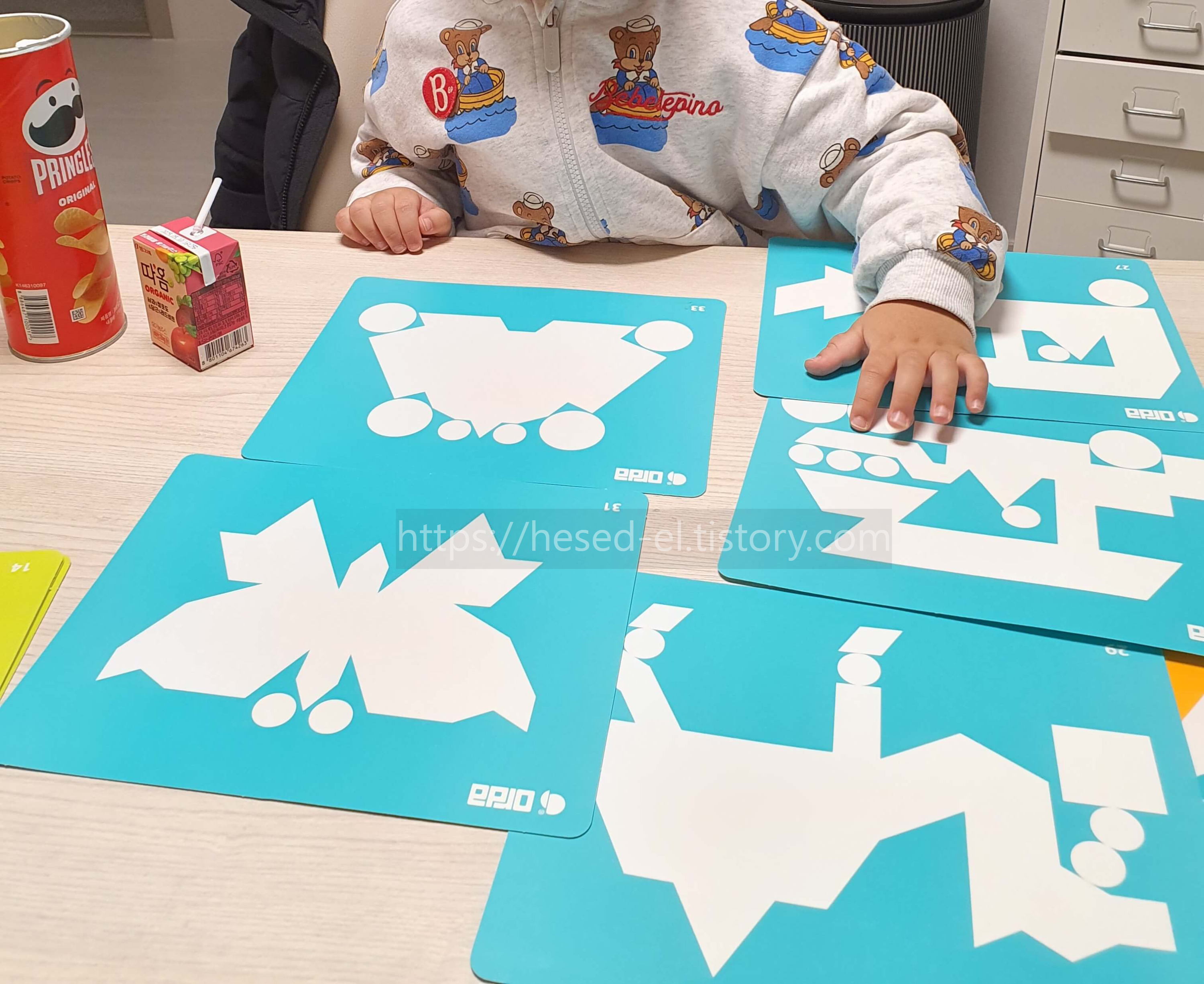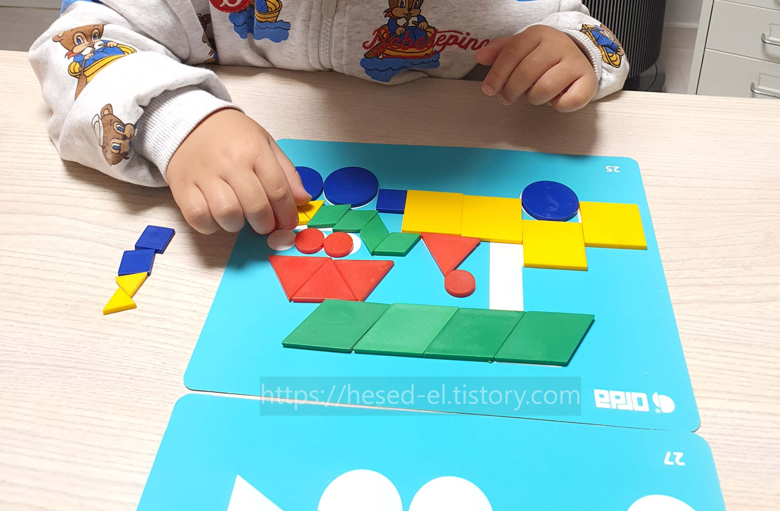 필자가 5세 아동과 수업하는 모습이다. 아동에게 활동 카드를 보여주고 자신이 원하는 카드를 고르게 한다. 그리고 특별히 힌트를 준다면 가장 큰 조각을 먼저 맞춘 후 작은 조각을 맞추게 지도한다. 그러면 아이가 원하는 곳을 먼저 맞추게 되고 조각을 맞추다 보면 약간 삐뚤빼뚤해질 수가 있기에 그럴 때 선생님이 삐져나온 부분을 정리해 주시거나 도와주면 된다.