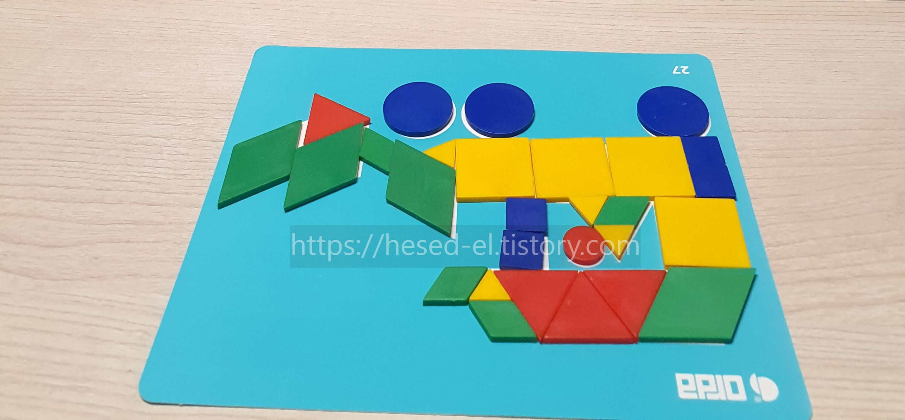 활동 목표: 여러 가지 도형을 이용한 전체 그림을 구성해보는 활동을 통해 도형의 형태, 색깔, 크기 등을 구별하고 여러개의 도형 조각이 전체 그림을 구구상력과 집중력, 소근육이 발달한다.